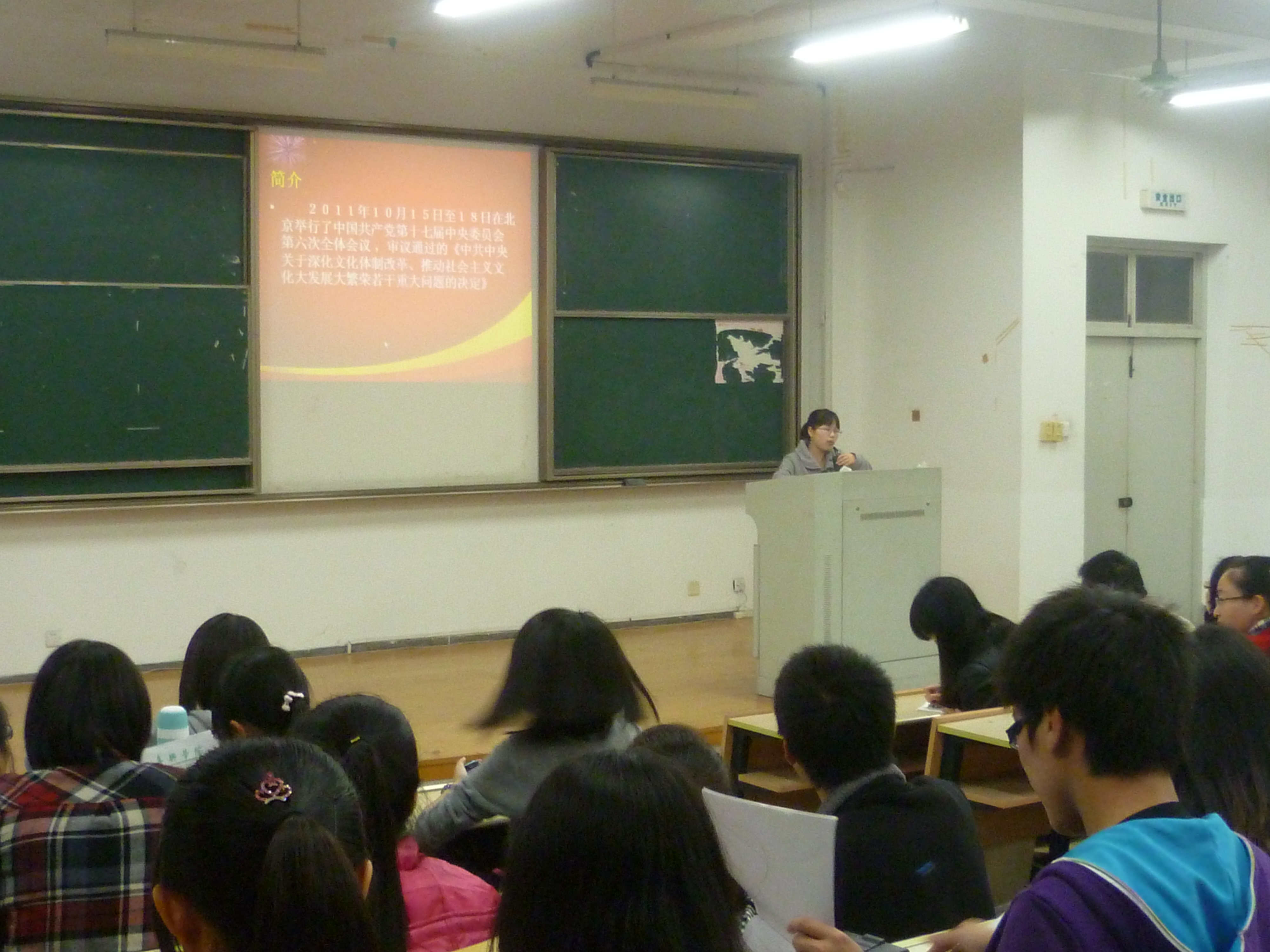 党总支积极行动,精心部署学习活动。各党支部、团支部、学院的读书协会等纷纷举办理论学习会,通过理论学习、观看视频、实例分析、分组讨论、代表发言、撰写心得体会等多种形式,认真学习、深刻体会、准确把握党的十七届六中全会精神。