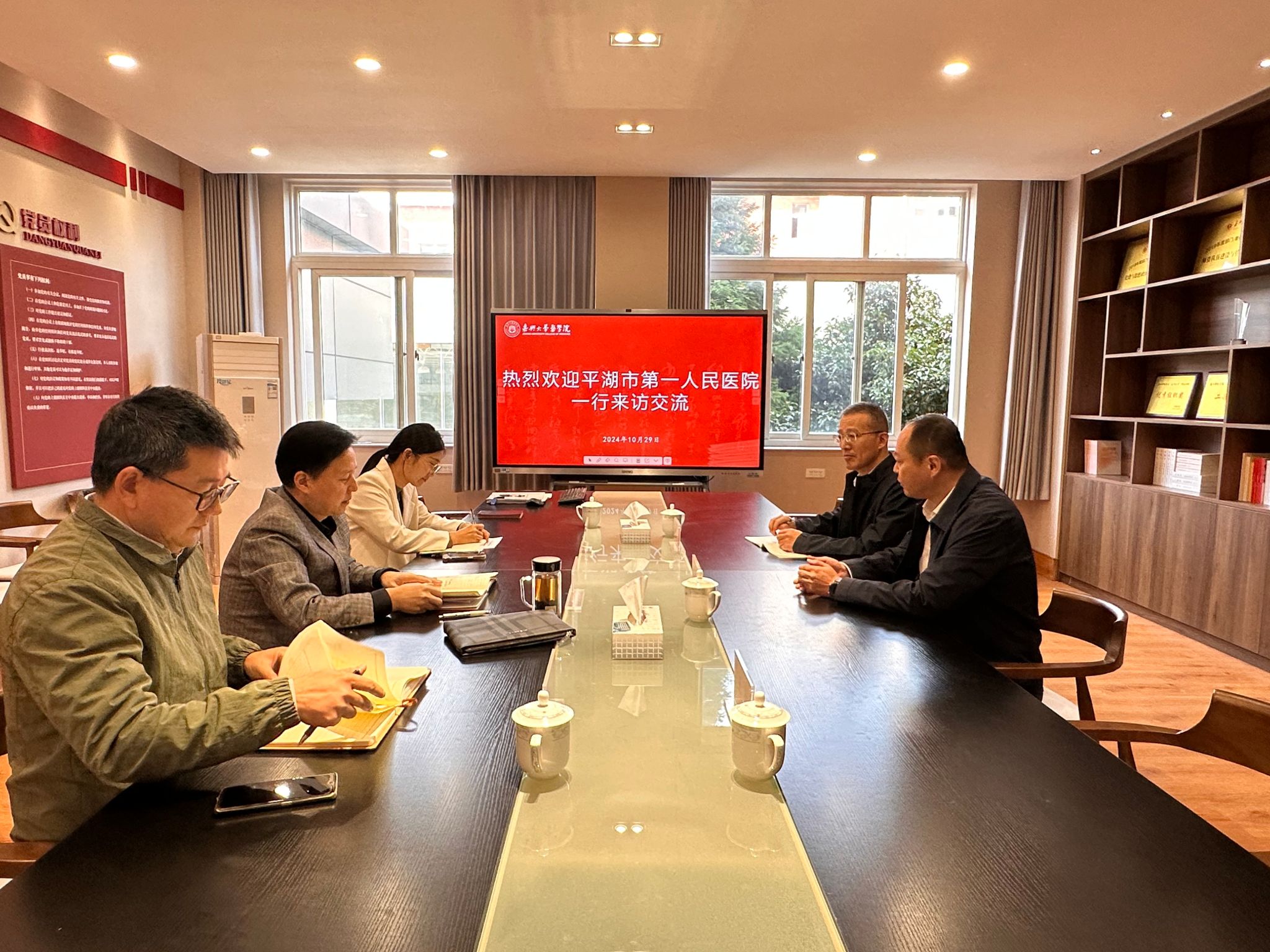 为加强av在线看 与平湖市第一人民医院之间科学研究及人才培养合作,1029日上午,平湖市第一人民医院院长孙军浩、科教科科长王磊一行受邀来院交流访问。av在线看 院长何治、副院长孙李丹、医管办主任姜肖明等出席此次交流。
