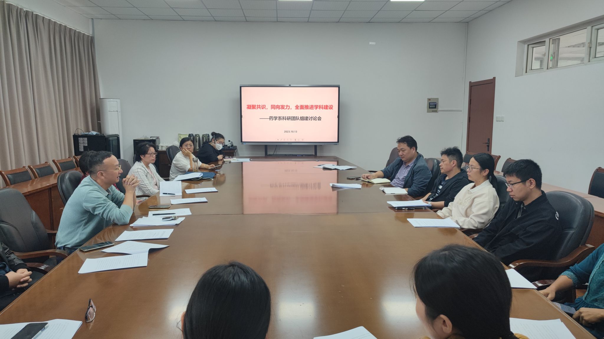 科研团队建设实施办法》的文件精神。系主任黄越燕结合学院近期的会议主题,总结分析了药学学科发展中存在的难点痛点,强调科研团队组建的重要性和必要性。系副主任谢宝刚等一批科研骨干教师介绍了自己的研究方向。与会教师从提高教师科研积极性和加强团队合作等角度,就团队实验室空间、保障措施、考核标准等方面进行了分析讨论,充分交换意见。