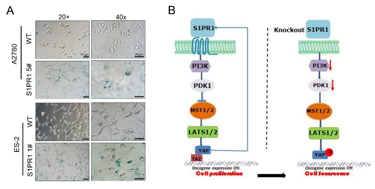 卵巢癌是常见的妇科恶性肿瘤,死亡率高,在治疗中存在化疗耐药、肿瘤转移及复发率较高等问题,其五年存活率约为44%。卵巢癌细胞耐药与衰老是否有关未见报道。本论文从临床样本、细胞和基因敲除小鼠等多方面证明S1PR1缺失促进卵巢癌细胞衰老,并增加卵巢癌细胞对化疗药物顺铂的敏感性(见图A)。机制研究发现,S1PR1缺失抑制3-磷脂酰肌醇依赖性蛋白激酶1 (PDK1)和Hippo信号通路关键蛋白大肿瘤抑制因子1/2 (LATS1/2)的表达,导致Yes相关蛋白(YAP)的磷酸化水平降低。染色质免疫共沉淀(ChIP)结果显示YAP可以与S1PR1启动子结合。这些结果表明在卵巢癌细胞衰老过程中S1PR1-PDK1-LATS1/2-YAP通路发挥着重要作用(见图B)。因此,S1PR1可能是促进卵巢癌细胞衰老的药物靶点,干预S1PR1-PDK1-LATS1/2-YAP信号轴可以增强卵巢癌化疗效果。