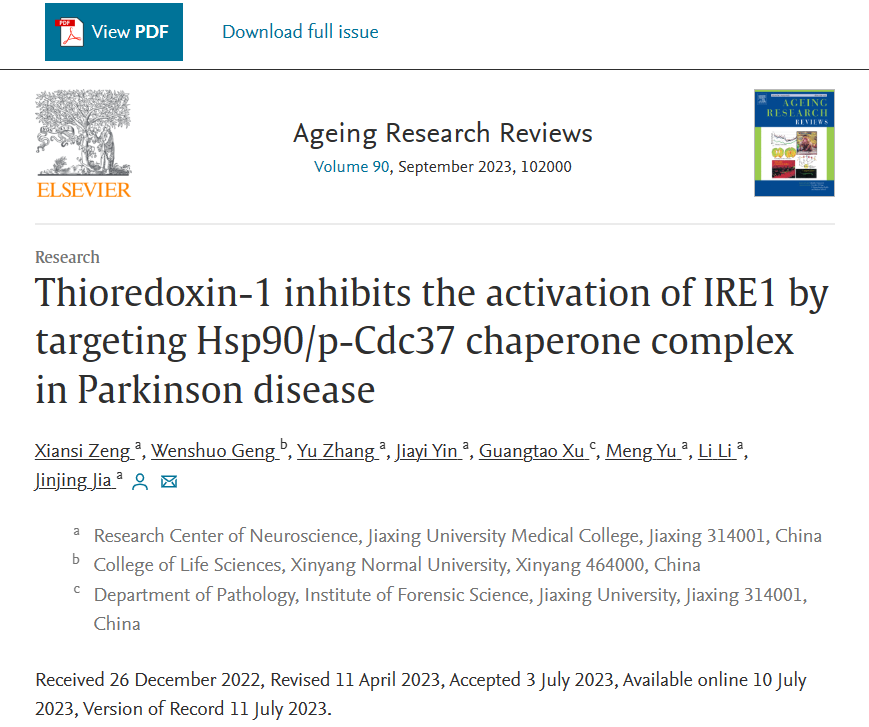 近日,国际著名SCI期刊、中科院一区TOP期刊Ageing Research Reviews以Research Article在线发表神经生物学团队的原创研究论文,题为:Thioredoxin-1 inhibits the activation of IRE1 by targeting Hsp90/p-Cdc37 chaperone complex in Parkinson disease。av在线看
