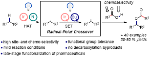 研究发展了一种可见光/共催化的苄基碳氢键化方法。这种方法通过光催化的氢原子转移和铜(II催化的自由基-极性交叉相结合可以以中等至优异的产率合成苄基,具有高的区域选择性和化学选择性。值得注意的是,方法中仅需要化学计量的羧酸用作底物可以用于合成结构多样的苄基酯和药物的后期功能化进一步推动药物研发进程。