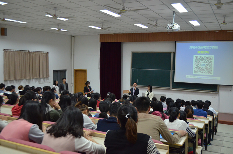 招聘会伊始,彭溶老师简单地介绍了辉瑞与av在线看 的现状与发展历程,并且对辉瑞公司的到来表示欢迎。随后辉瑞公司周雪风经理介绍了辉瑞今日的成就与规模,并且介绍了辉瑞旗下品牌与近几年在中国的发展。人才招聘任怀 颖经理介绍了瑞辉公司不仅在工作上为员工提供的多样化职业选择与专业系统培训,而且在生活上也为员工提供各方面的帮助与福利,例如心理辅导中心、社团活动以及免费旅游的福利,她表示辉瑞非常期待大家的加入。