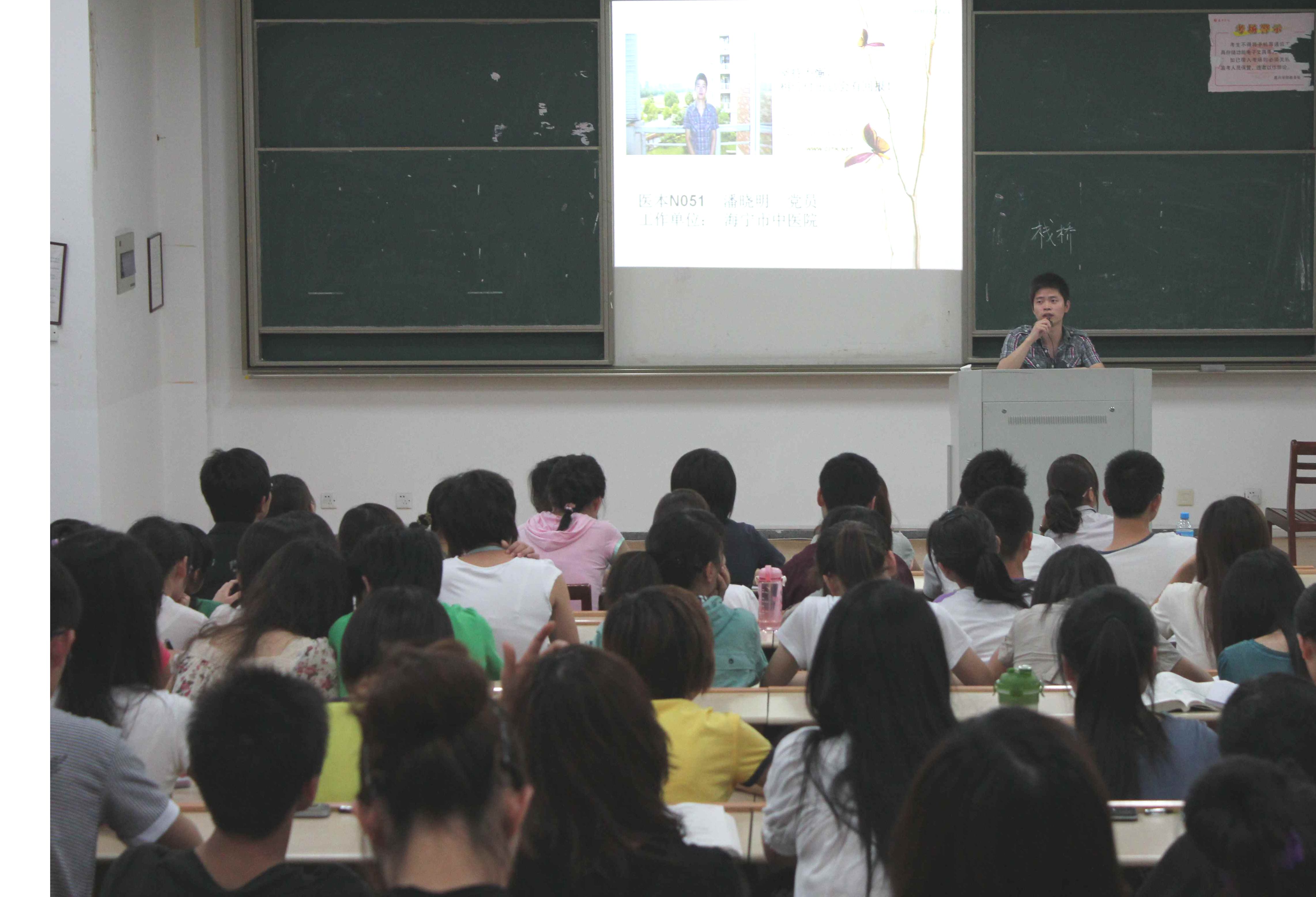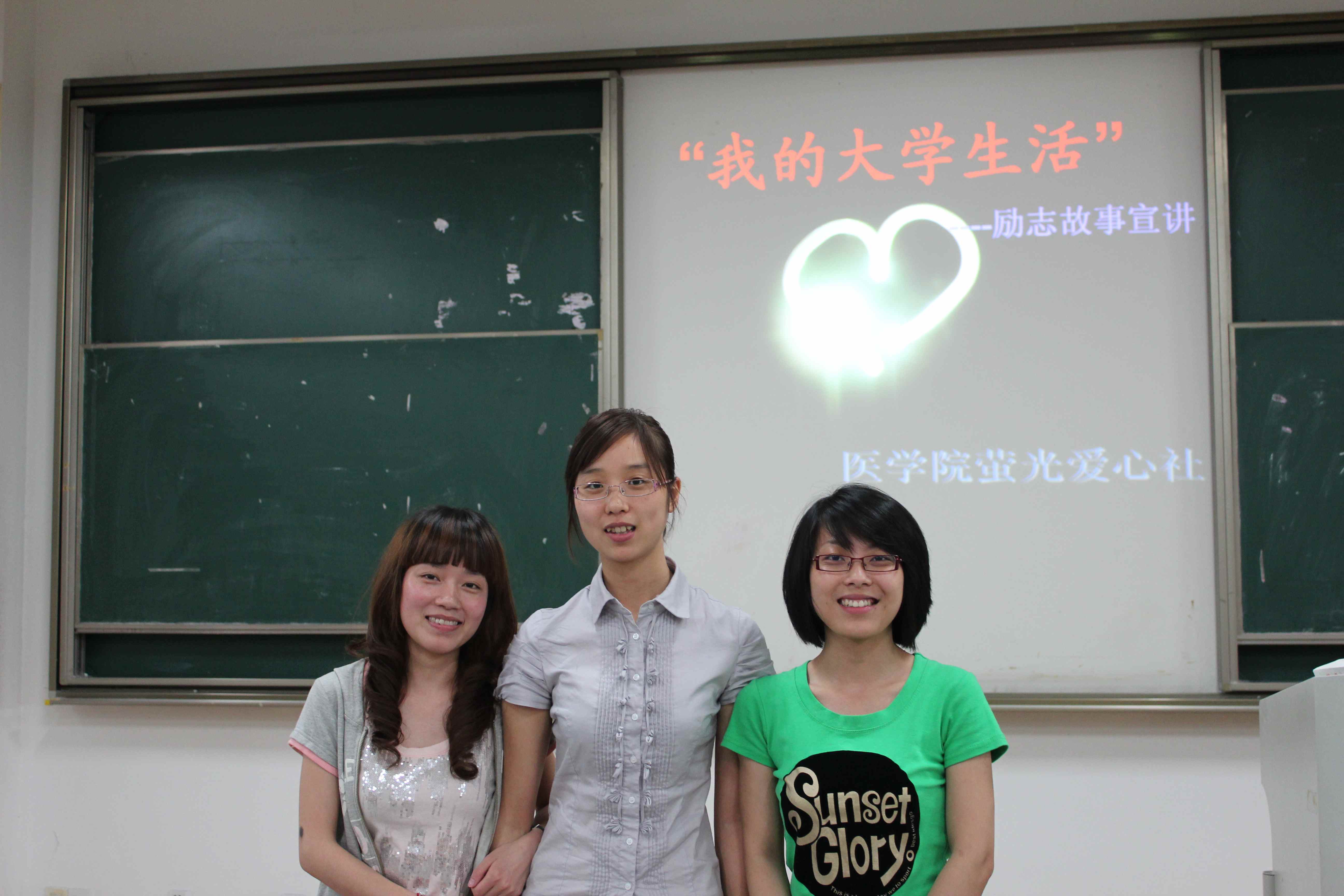 6月12日晚上6点半,在教四221举行了由荧光爱心社承办的“我的大学生活”励志故事宣讲活动,av在线看 党总支副书记谢宏老师、学工办杨敏老师和社工委副主席孙巧云同学及av在线看 全体贫困生、荧光爱心社成员参加了此次活动。 本次活动特邀请了医本051徐欢、医本051的周少余、医本N051的潘晓明和护本061的吴毅疑四位2010届毕业生来为大家讲述他们不平凡的大学生活,和学弟学妹们分享他们在学校、在实习中所获得的宝贵经验,以此来激励大家学会把握自己,励志成才。 最后,谢宏老师做了总结发言,她强调:虽然我们不能选择自己的出生,但我们可以选择自己的人生,同时她也勉励大家:选择坚强,选择不松懈不放弃,我们的人生道路才会走得更好、更远!