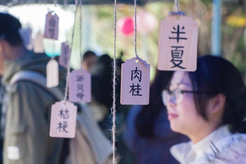 此次活动主要分为中药香囊制作、中药药材展示、免费药茶品尝三个部分。活动当天,天公并不作美。乌蒙蒙的天、淅淅沥沥的雨、刺骨的寒风并没有削减同学们参与活动的热情。活动现场,伴随着清幽的古风乐,志愿者们为前来参加活动的同学们讲解药材名称与主要功效,当归、白芷、党参等常见药材应有尽有。大家将各味药材装入精美的囊袋中,简单收口,一个个小巧讨人的小香囊便制作完成。茶壶外,空气中弥漫着淡淡的茶香和药香;茶壶上,白雾袅袅上升又慢慢散去;茶壶里,药材的颜色慢慢渗出,在无色透明的沸水中晕开;这一切都给人以美好宁静之感。