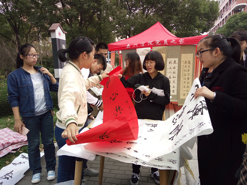 早在上午八点多,韩老就已经来到嘉兴学院,亲临书画协会义卖活动现场,活动现场展示了数十幅韩先生的书画作品。在中午11点左右义卖正式开始,来欣赏书画作品的同学也逐渐增多,不少同学借义卖的机会收藏了韩先生的书画。