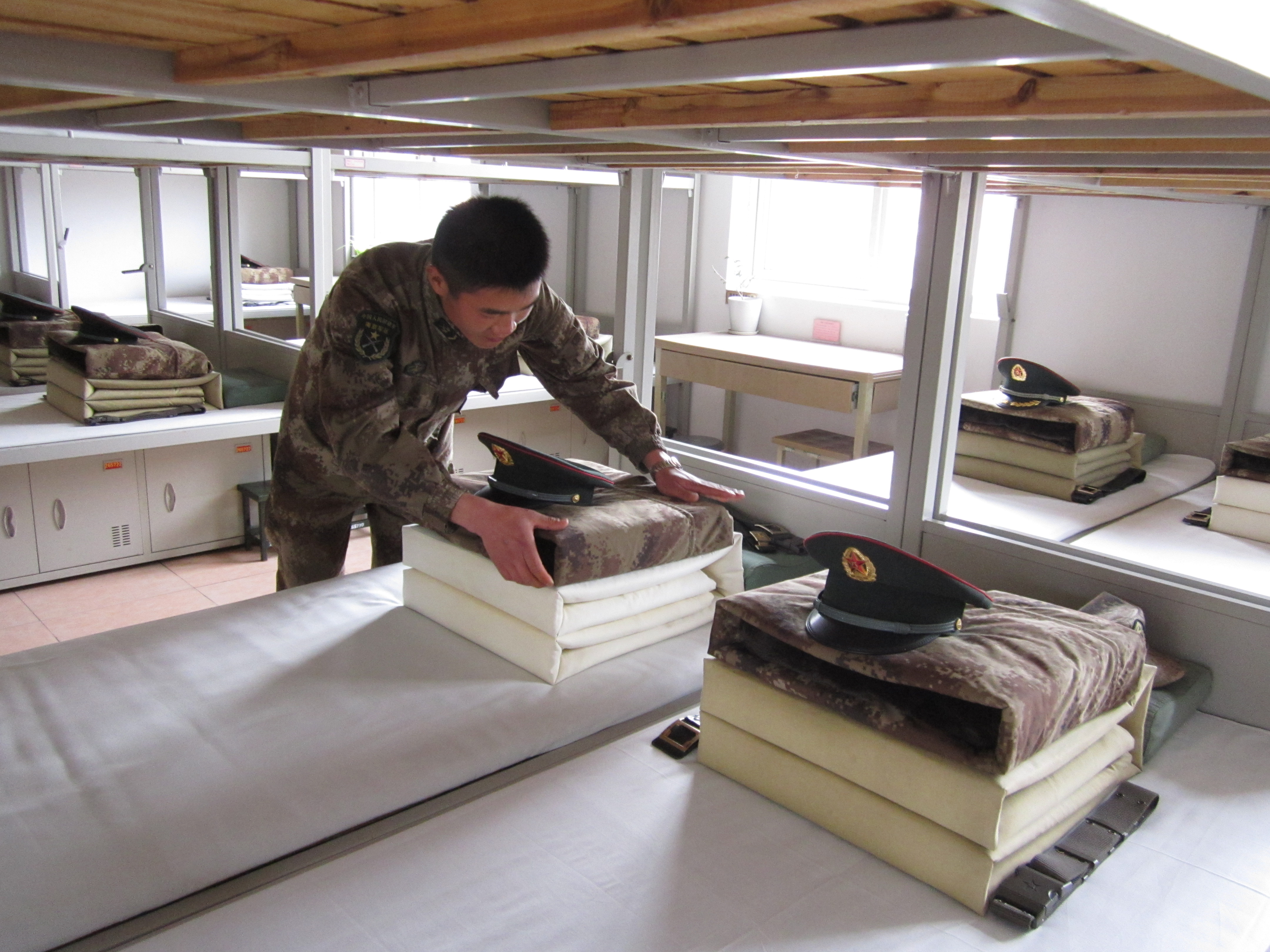 随后,大家参观了团史馆,生动的图片展览、鲜活的历史遗物,光荣的锦旗和奖杯,都展示着部队所走过的光辉历程,让同学们不由得肃然起敬。接着,同学们参观了战士的生活区,解放军同志为大家现场示范了叠“豆腐块”被子。最后同学们参观了最感兴趣的各种战斗武器和装备,一尊尊铁甲战士,让同学们增长了见识,也让大家对祖国国防建设的现代化感到自豪。