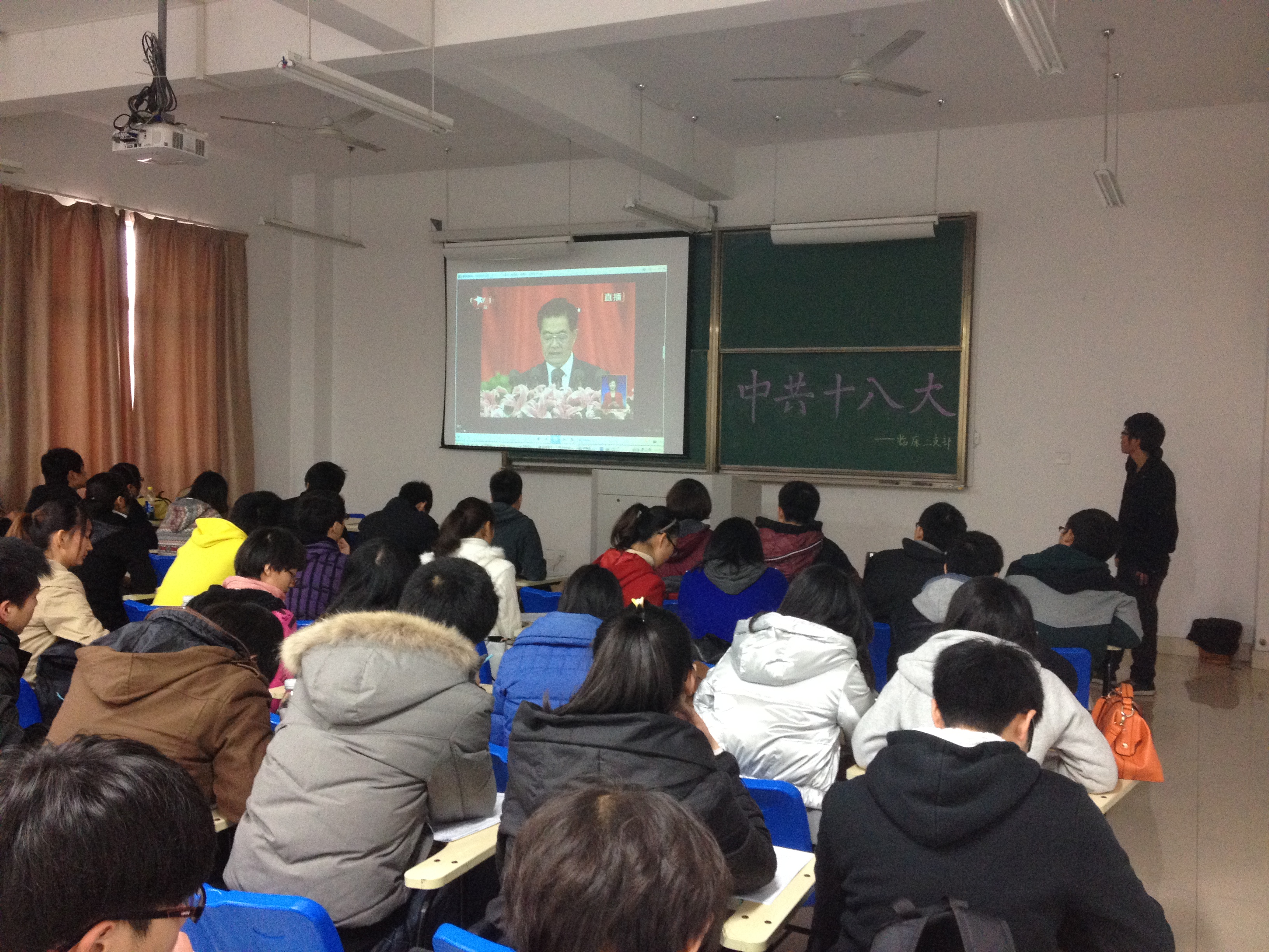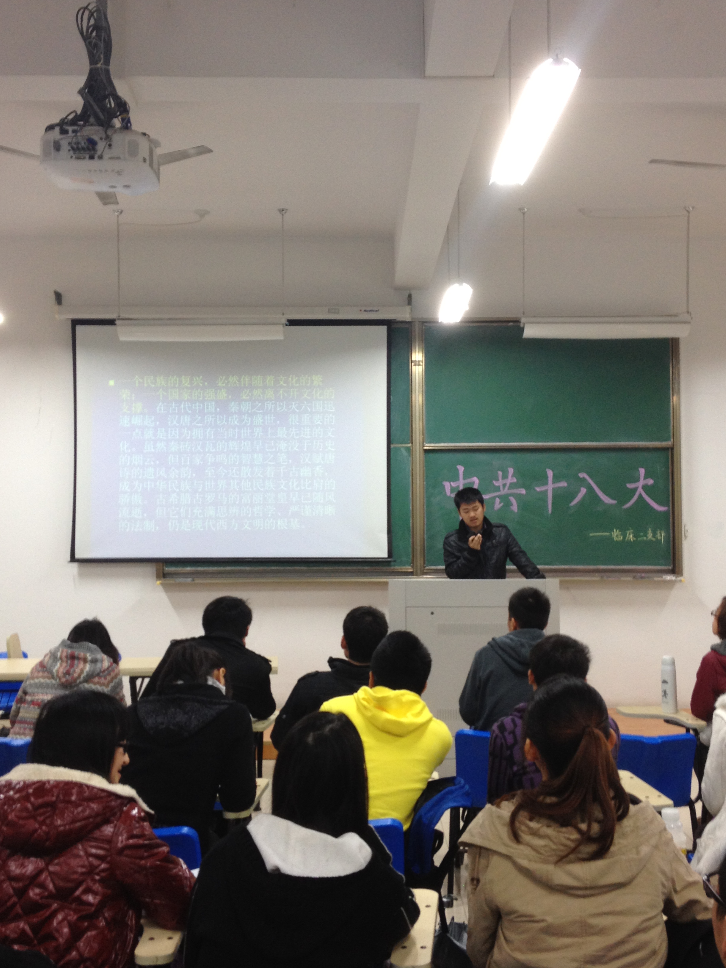 2012年11月25日临床二支部在10号楼302举行有关学习十八大报告精神的会议。参加此次会议的有医本N101,N102,N111,N112的党员、预备党员及入党积极分子等60余人。