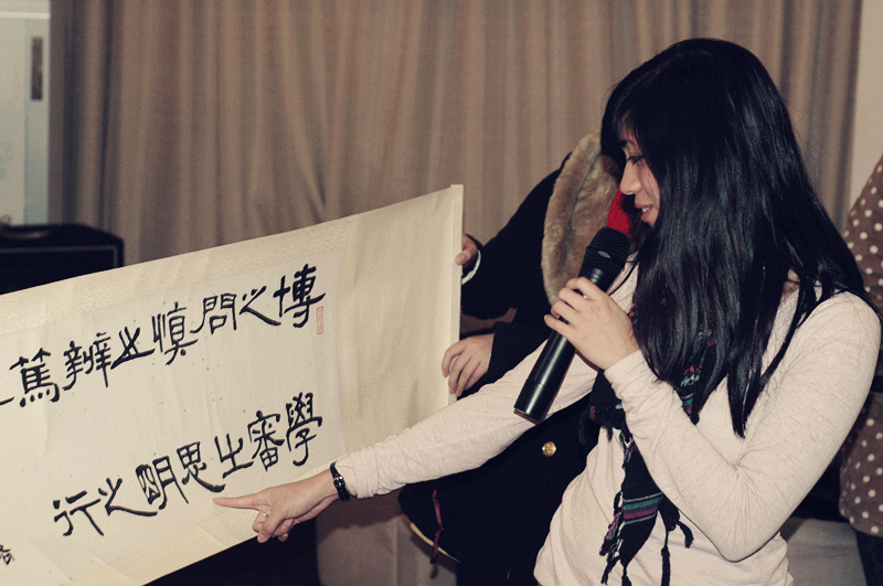 同学们也尽情展示才艺,表演了吉他弹唱、笛子独奏、英文歌曲,并且赠送了中国书法给美国学生,其乐融融的氛围,让每个人陶醉其中,最后party在美国学生带领全场人员一起跳舞的欢快节奏中缓缓结束,让人意犹未尽。