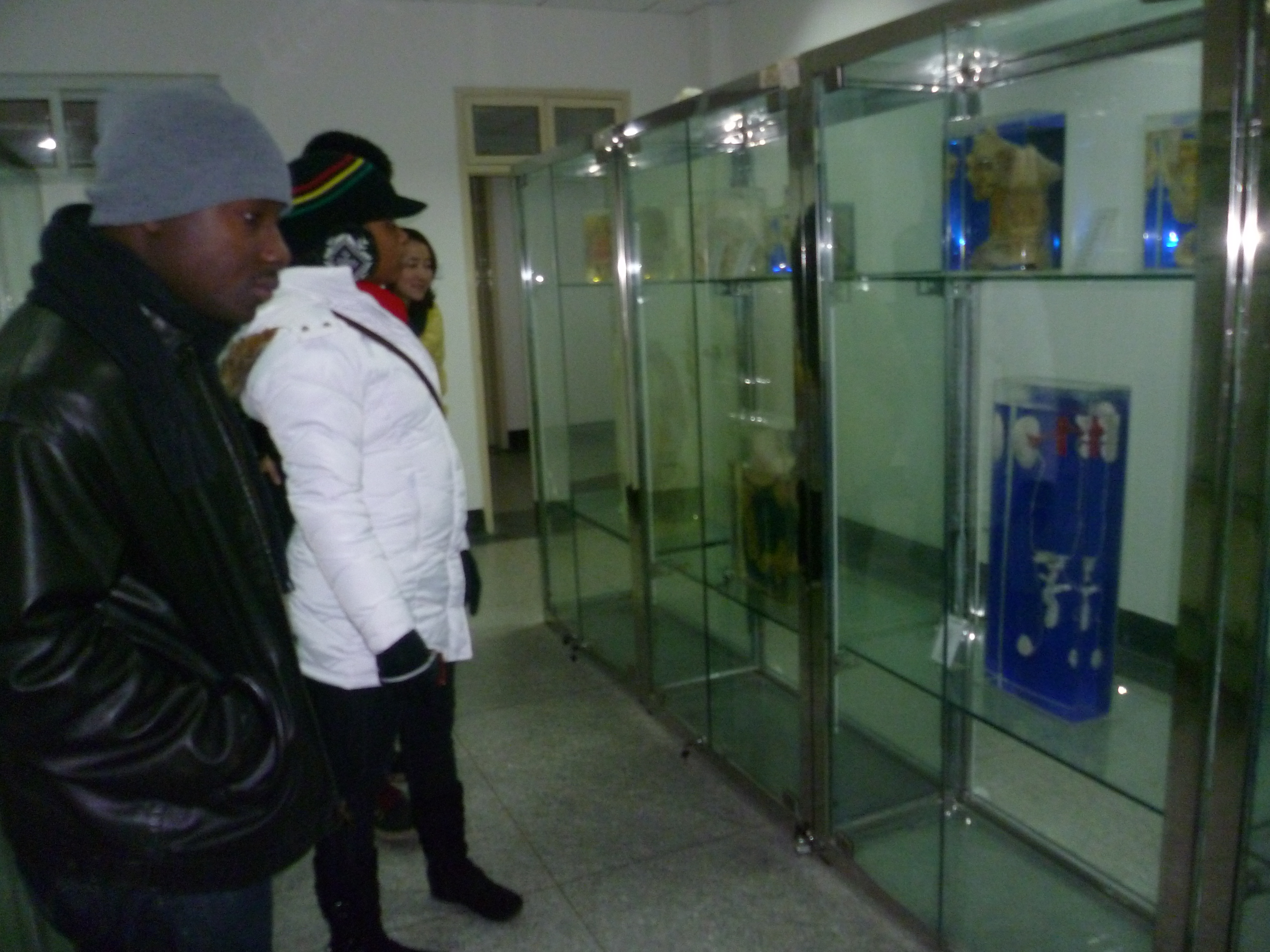学生带领美国学生参观医学实验中心,在二楼人体解剖标本室和六楼模拟医院,美国学生都饶有兴致的进行参观学习,并啧啧称奇,很感兴趣。
