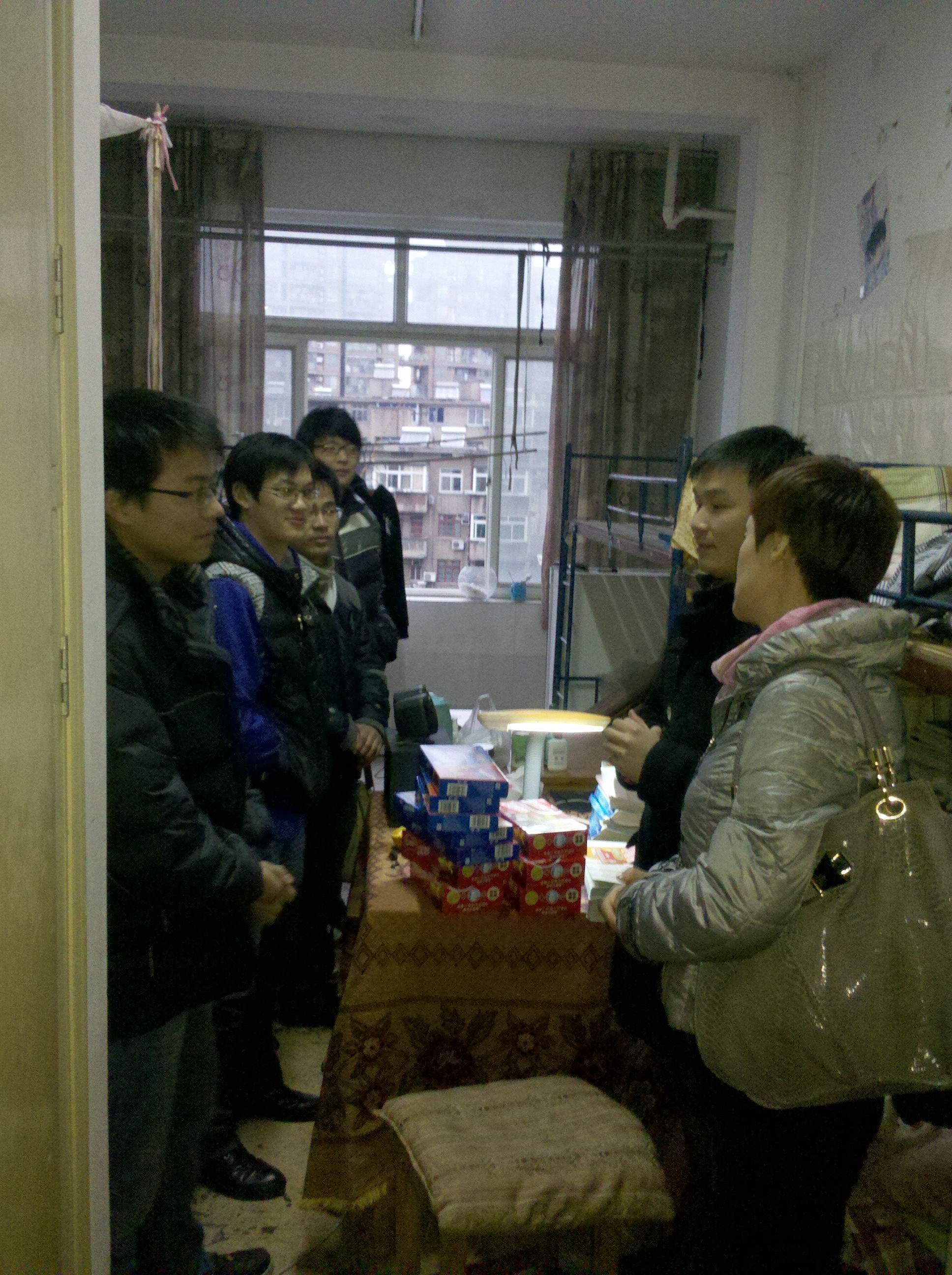 av在线看 2012届毕业生中共有149人报考了2012年的研究生入学考试,占毕业生总人数的36.6%,是历年来报考人数之最,目前考研备战已进入白热化阶段,为了在最后阶段给大家鼓劲,12月27日下午4点半,av在线看 张杰书记、谢宏副书记、学工办蒋小红主任、彭溶老师带着精心准备的慰问品来到老卫校宿舍看望考研学生。 张杰书记首先代表学院向考研学生表示亲切的慰问,叮嘱他们要保证营养、注意身体、积极备考,并预祝他们在2012年研究生入学考试中取得好成绩。谢宏副书记也希望同学们在冲刺最后阶段,把身心调整到最佳状态,取得考研的最终胜利。 同学们纷纷表示一定不辜负领导和老师的殷切希望,争取在2012年研究生入学考试中取得优异成绩!