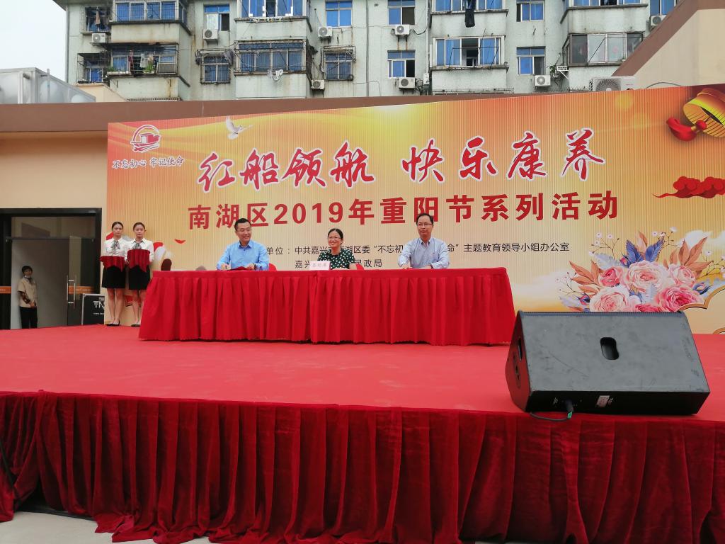 现场还举行了由中共嘉兴市南湖区委“不忘初心、牢记使命”主题教育领导小组办公室、嘉兴市南湖区民政局共同举办的“红船领航 快乐康养”南湖区2019年重阳节系列活动。