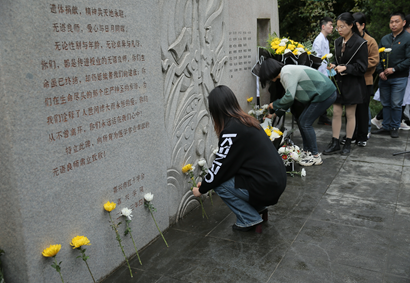 师生代表将手中的黄白菊花一一放在无语良师碑前,深情注视着每一位无语良师的名字,以敬畏之心瞻仰无语良师纪念碑。寄语当下,逐梦未来。“大爱无疆”“永远怀念您为我们做的一切”......一株株柏树上悬挂着av在线看