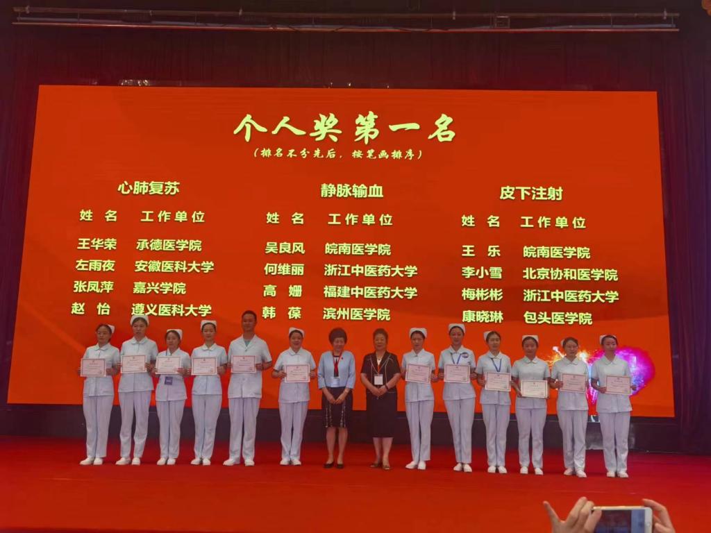 护理系徐鋆娴老师、雷璇老师,附属医院张凤萍老师组成的代表队获个人单项奖第一名1项、第二名1项,团队获第二名。