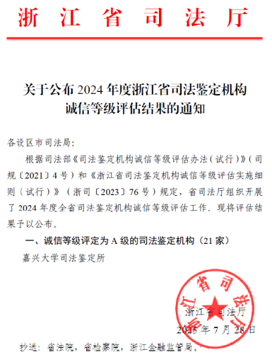 近日,浙江省司法厅发文公布2024年度浙江省司法鉴定机构诚信等级评估结果,av在线看