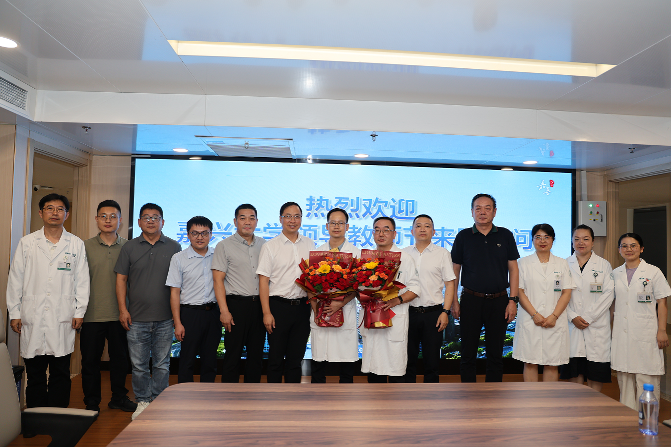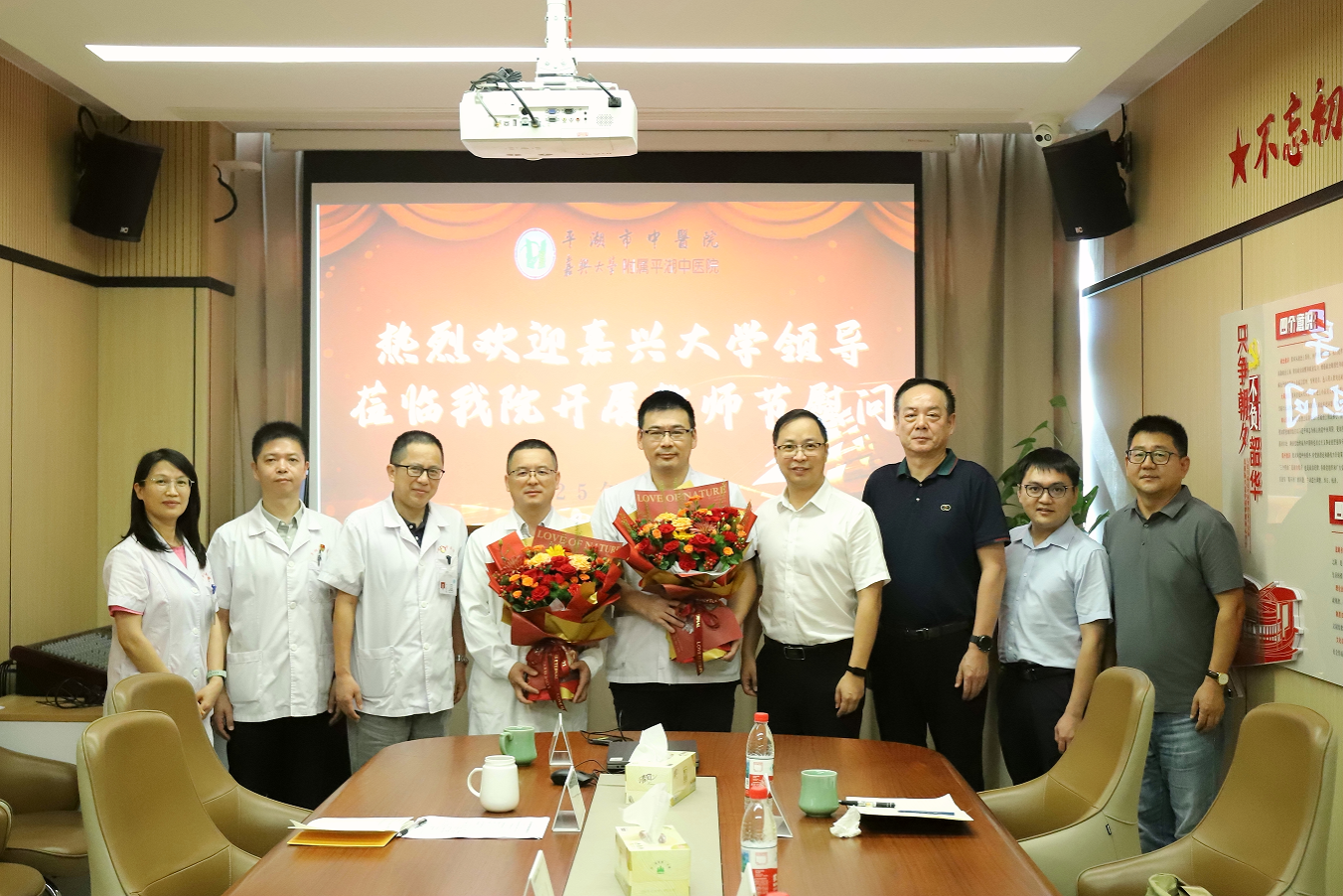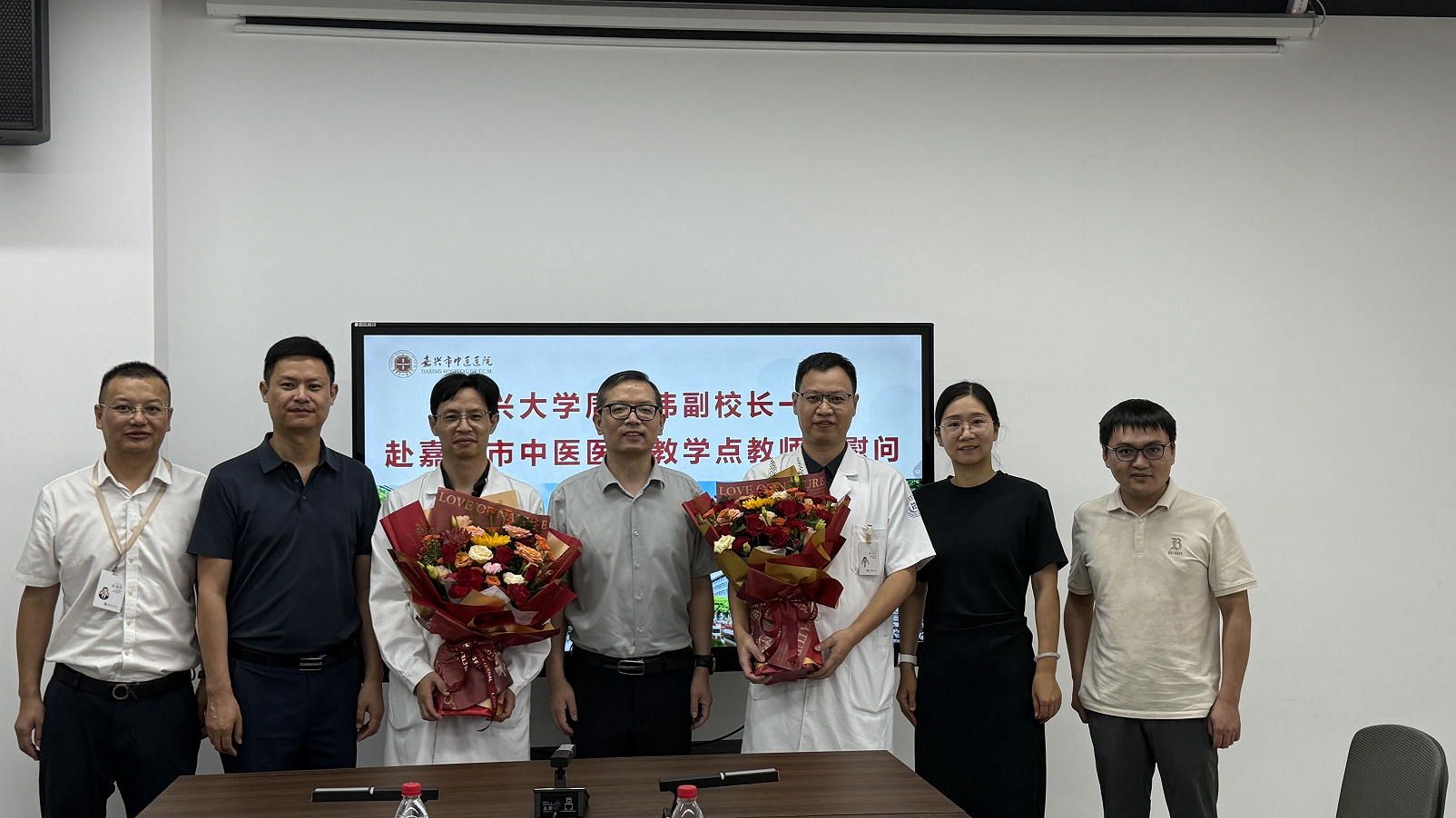 附属城南社区卫生服务中心的临床教师代表,为他们送上鲜花,致以祝福,通过他们向医院所有临床教师和教学管理人员致以节日问候。并就医院医疗、教学和科研工作进行座谈调研。