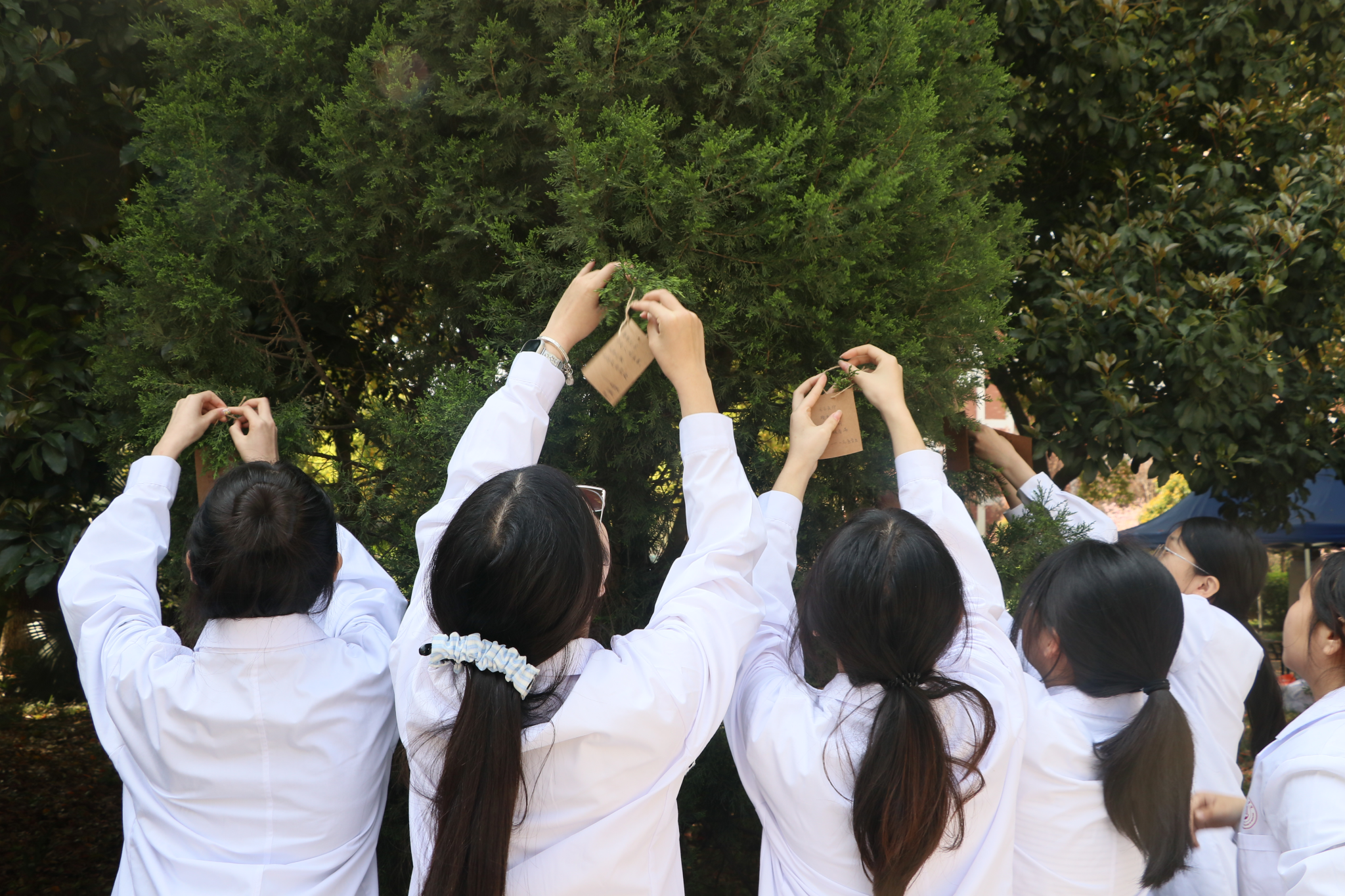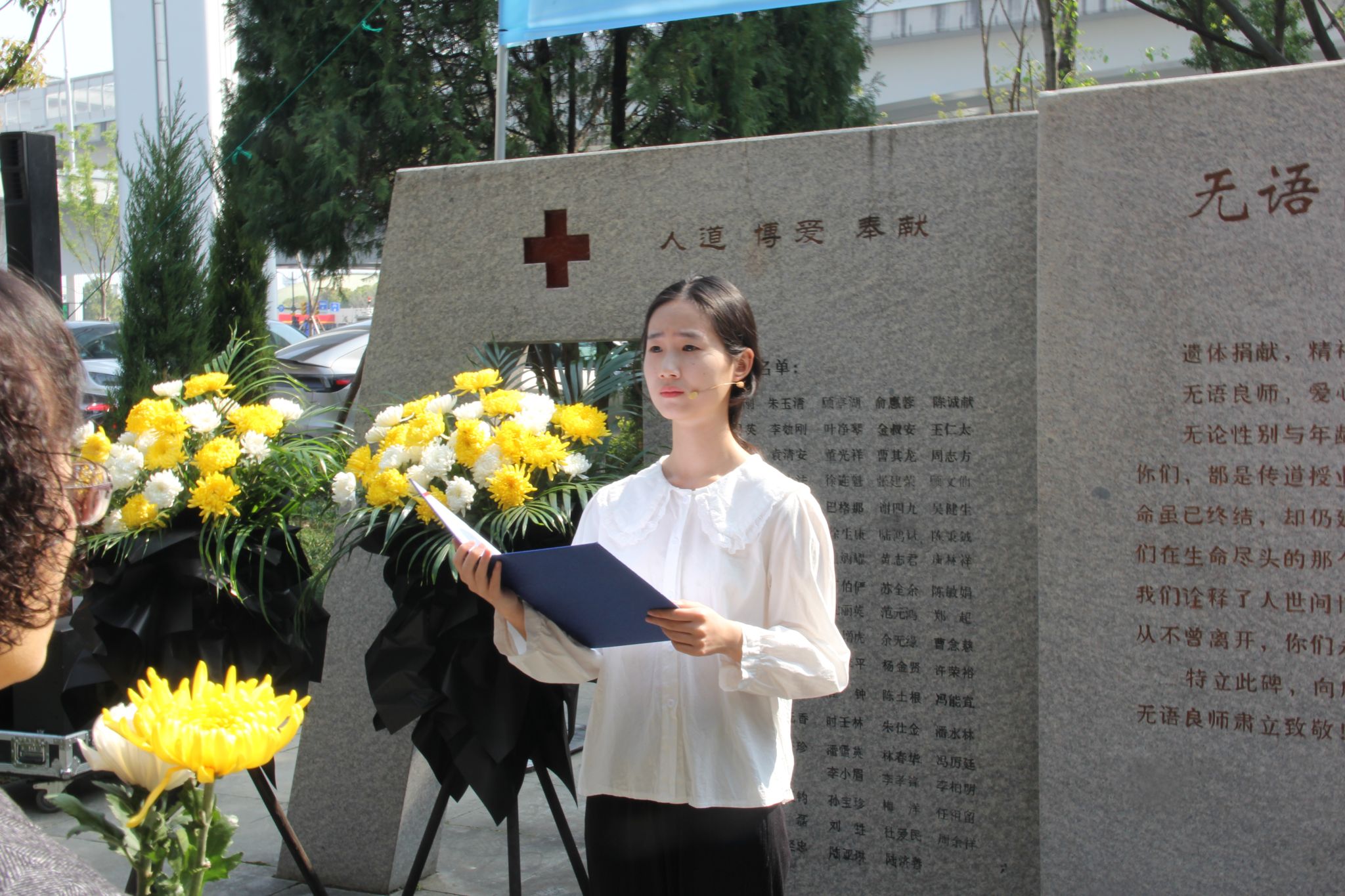 仪式最后,家属代表、领导、师生依次向无语良师碑献花,医学生们将心愿卡挂于碑旁松树上,以青春寄语致敬生命大爱。